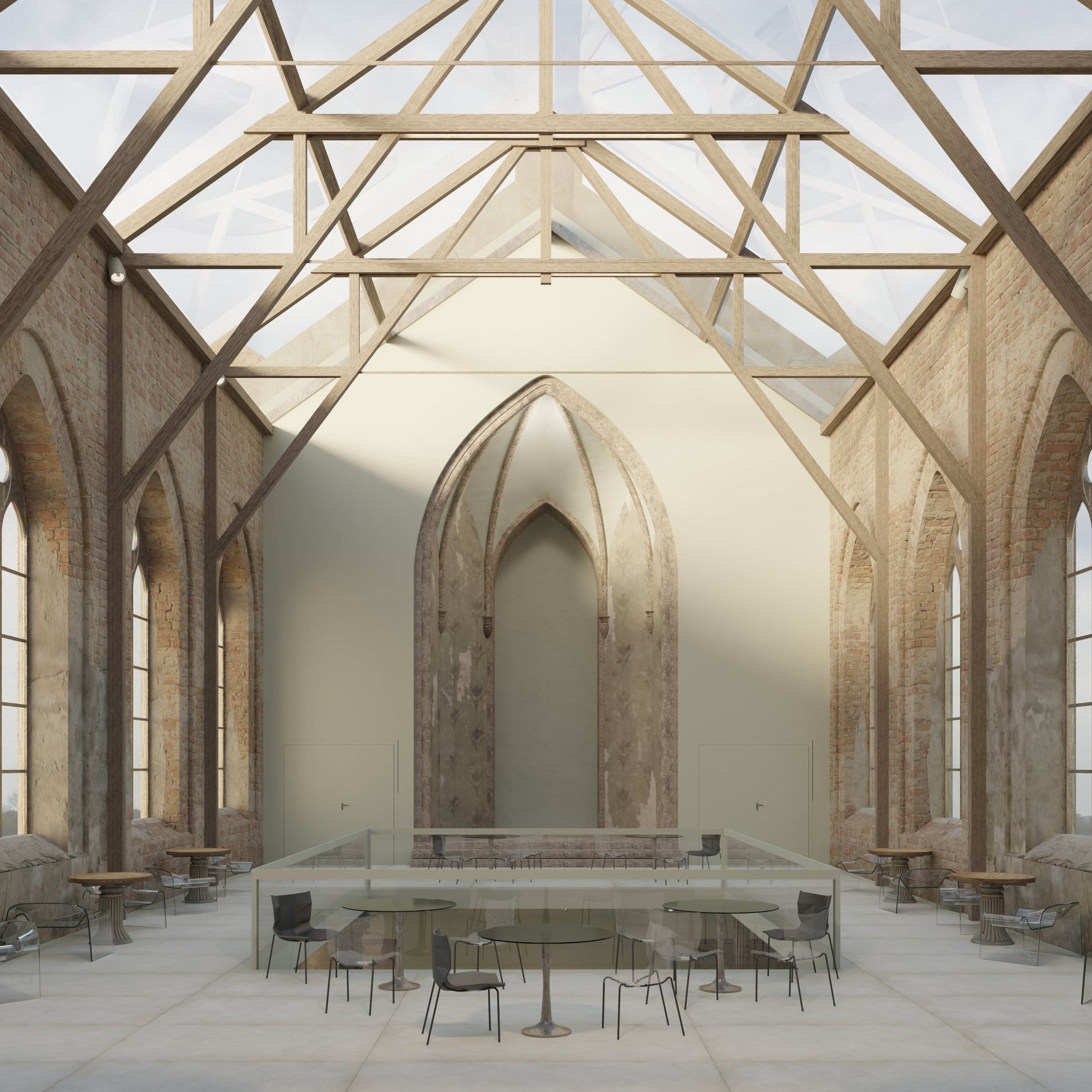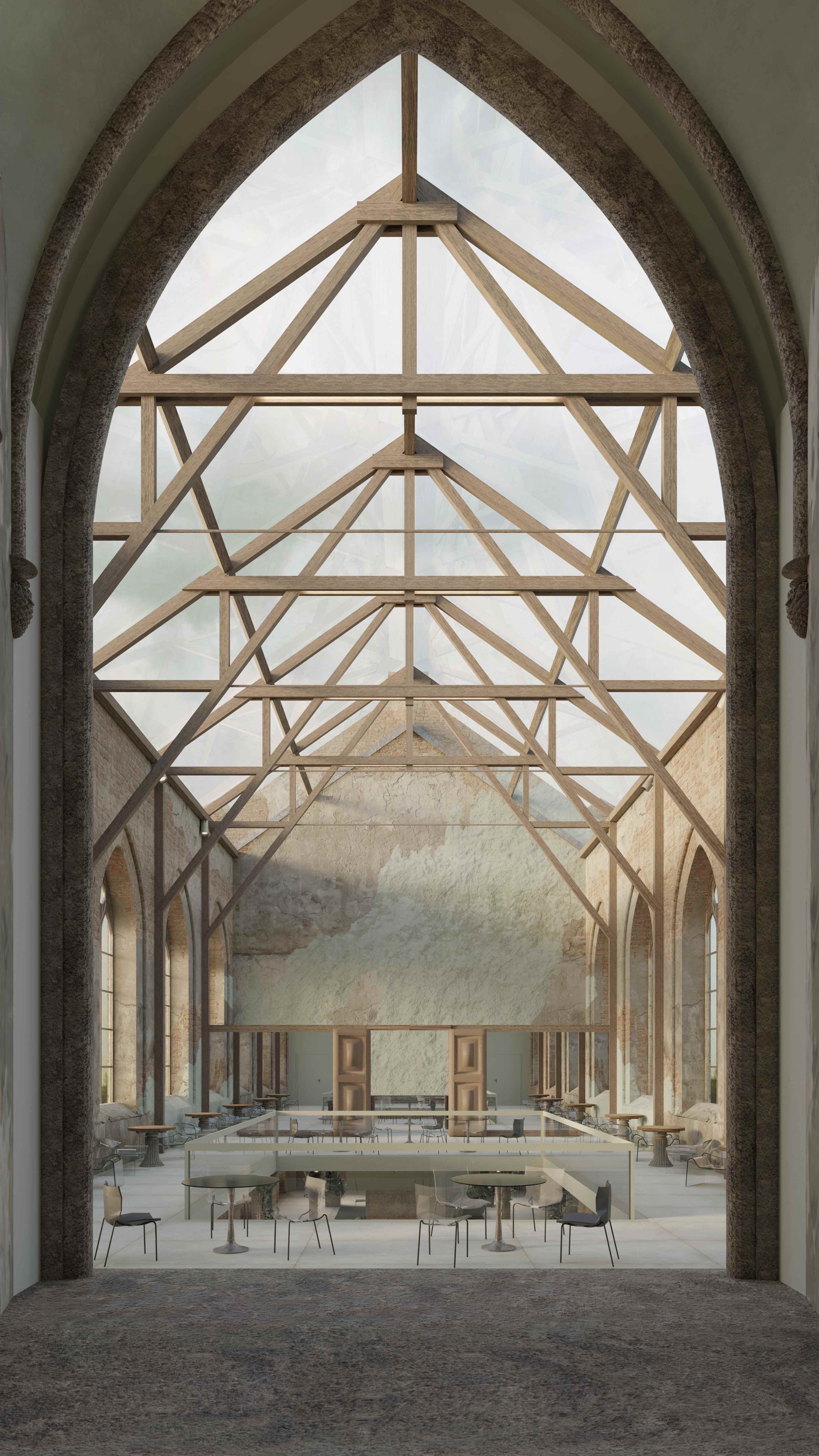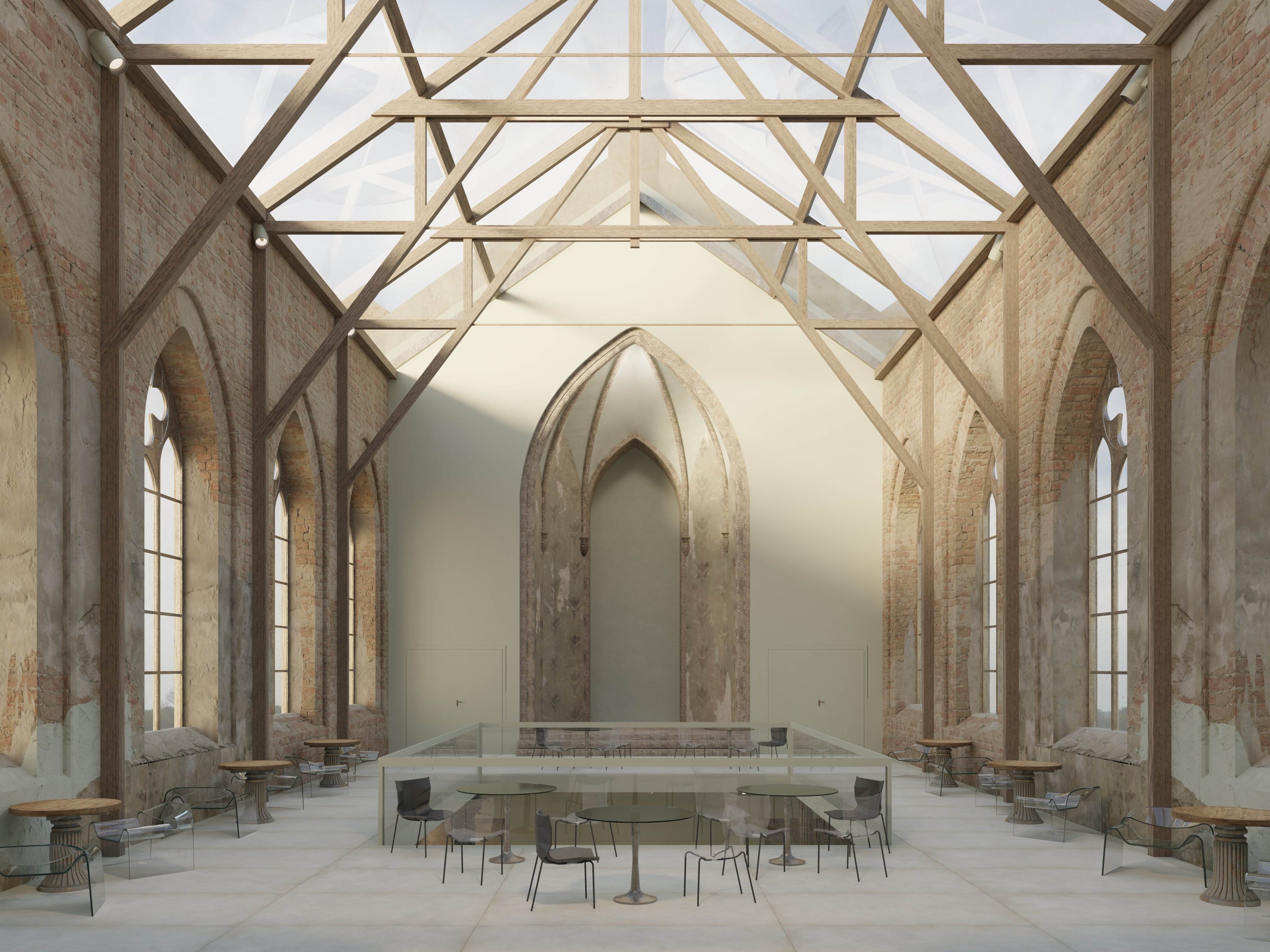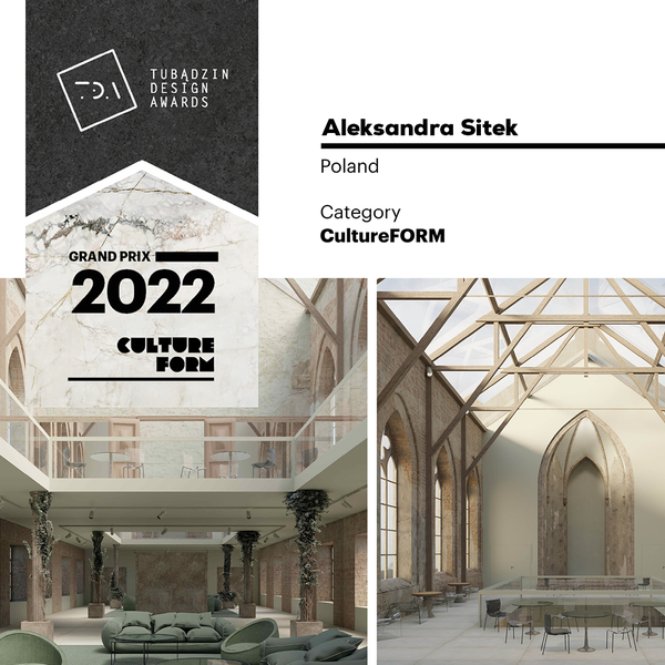 Projekt adaptacji pozostałości XIX-wiecznego kościoła we Wrocławiu, jest odpowiedzią na katastrofę budowlaną z 1991 r., która spowodowała zawalenie się dachu. Panorama otwartego nieba i urok naturalnego procesu starzenia się murów, przywołują kreatywność i zachęcają do refleksji. Zainspirowały mnie do stworzenia przeszkleń, które ocieplają minimalistyczne, ascetyczne wnętrze. Projekt ma spełniać dwie funkcje: z jednej strony być miejscem spotkań. Z drugiej – sam charakter świątynny wnosi powiew kontemplacji pielęgnując życie duchowe współczesnego, zabieganego człowieka.