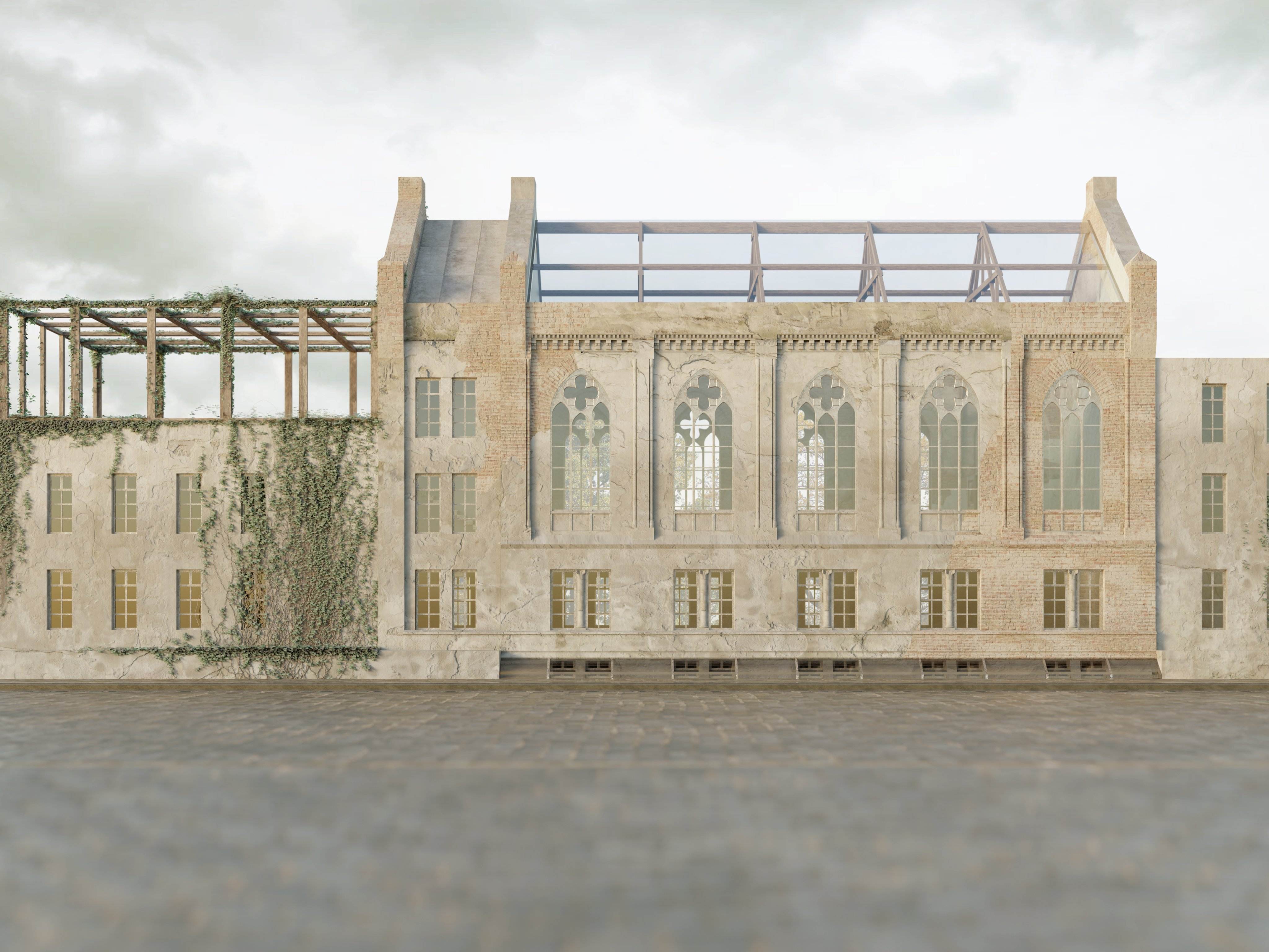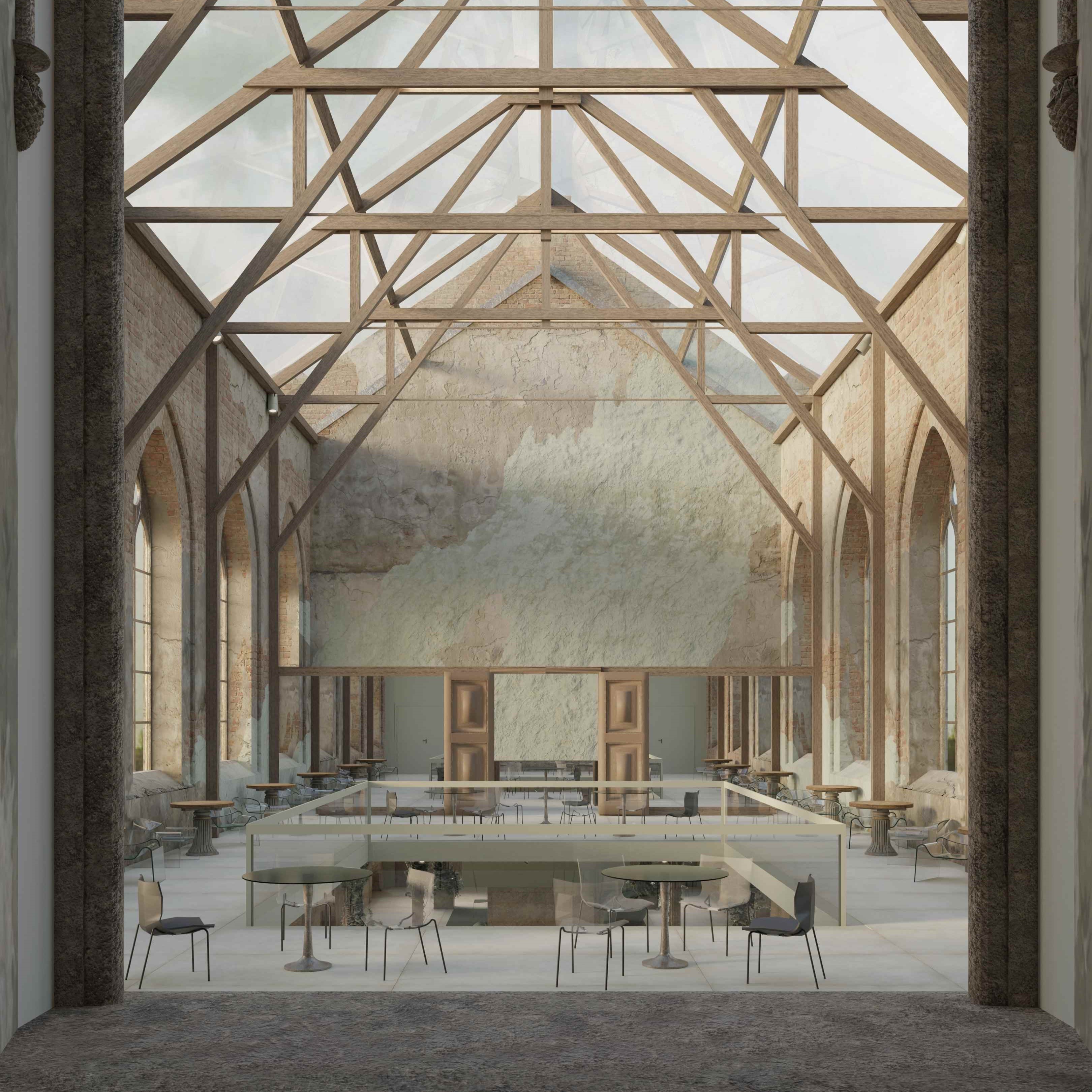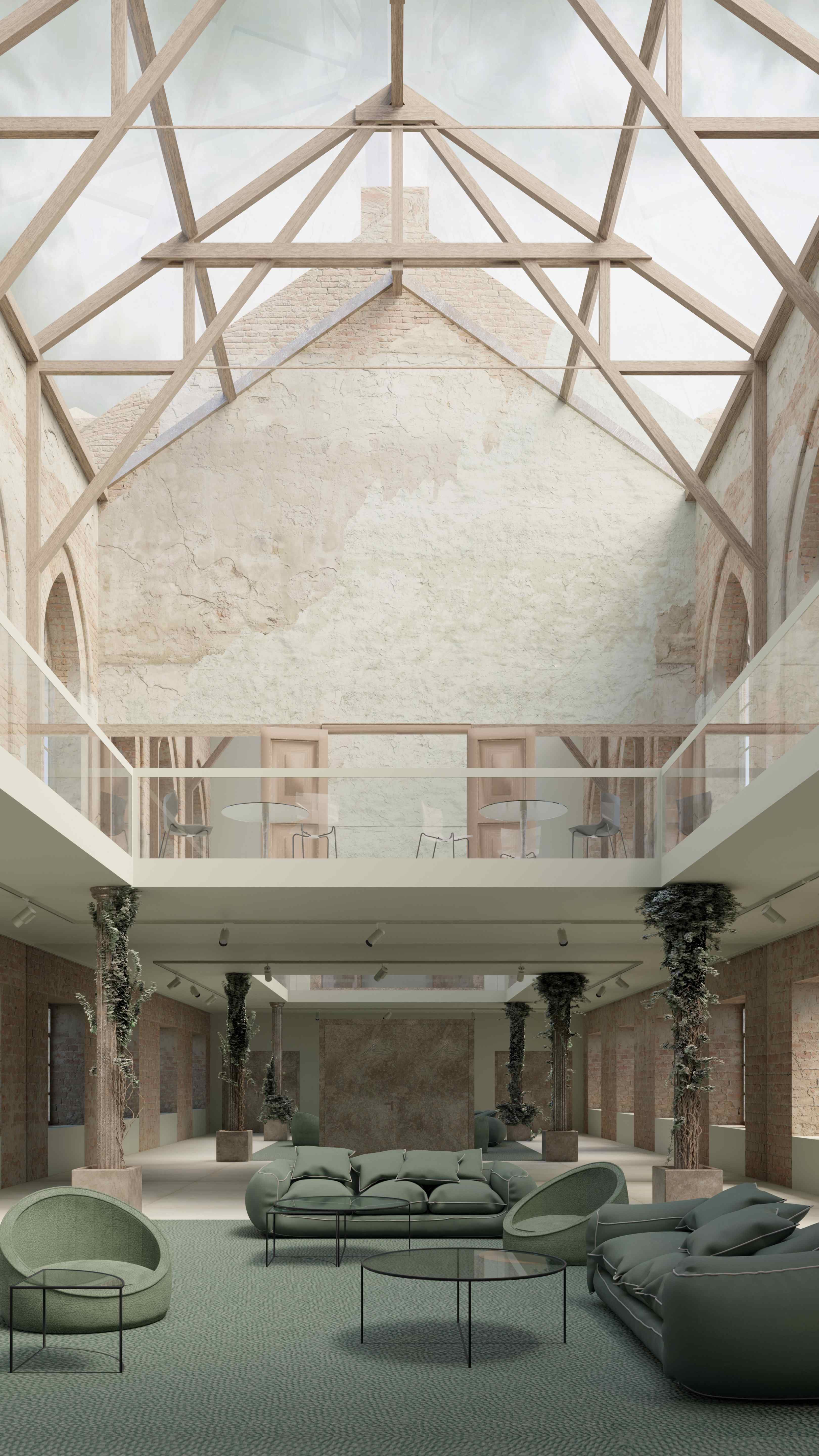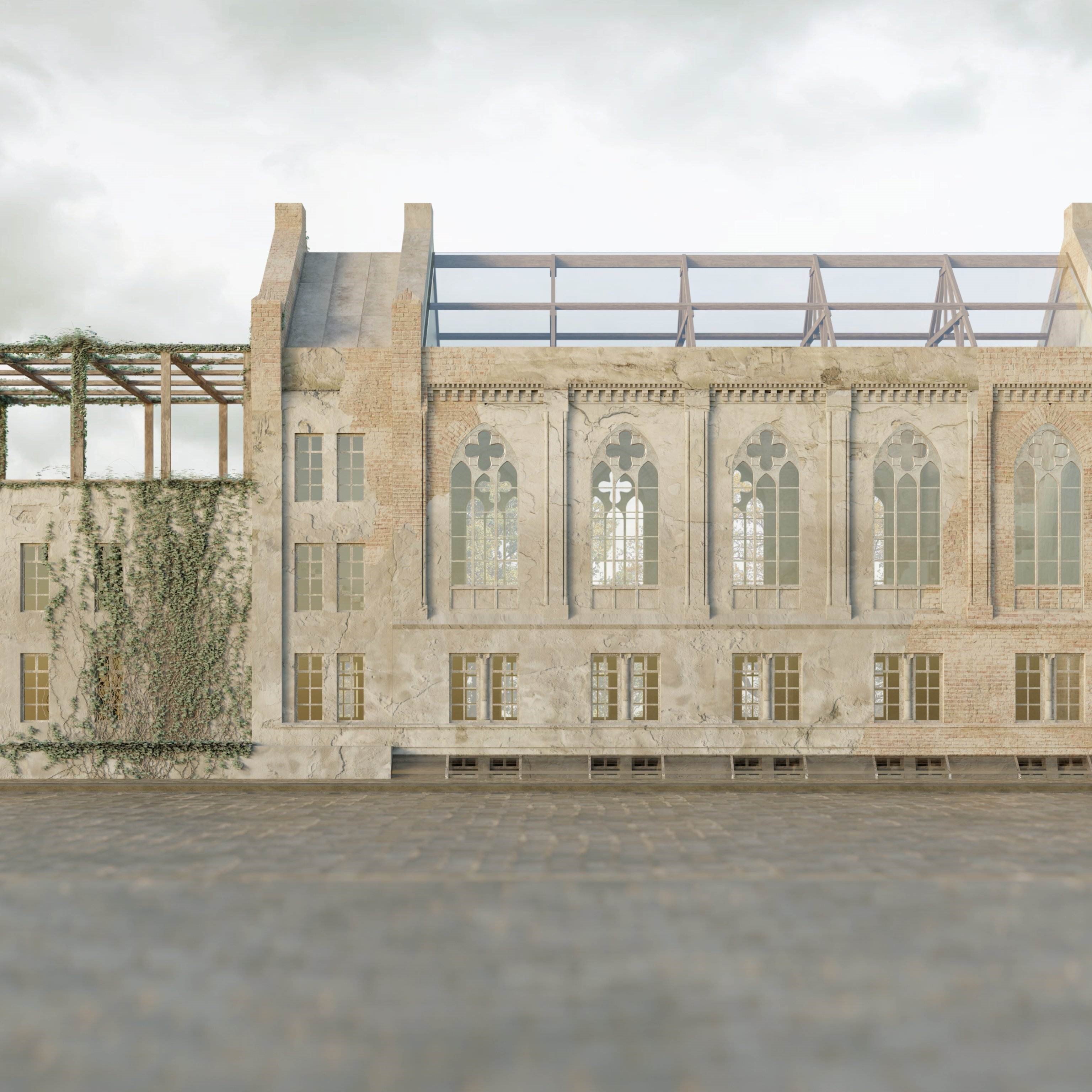 Projekt adaptacji pozostałości XIX-wiecznego kościoła we Wrocławiu, jest odpowiedzią na katastrofę budowlaną z 1991 r., która spowodowała zawalenie się dachu. Panorama otwartego nieba i urok naturalnego procesu starzenia się murów, przywołują kreatywność i zachęcają do refleksji. Zainspirowały mnie do stworzenia przeszkleń, które ocieplają minimalistyczne, ascetyczne wnętrze. Projekt ma spełniać dwie funkcje: z jednej strony być miejscem spotkań. Z drugiej – sam charakter świątynny wnosi powiew kontemplacji pielęgnując życie duchowe współczesnego, zabieganego człowieka.