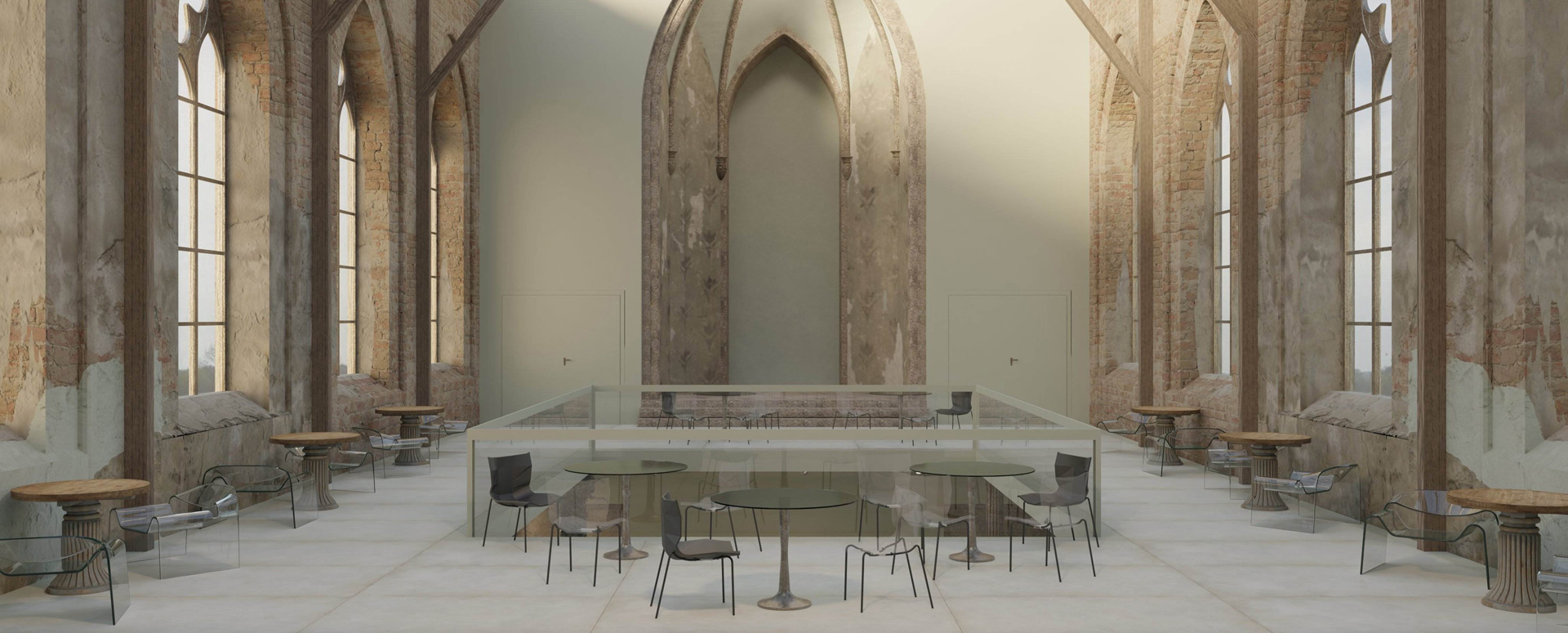 Miejsce kontemplacji z funkcją wystawienniczą i kawiarnią w ruinach dawnego kościoła ewangelickiego…